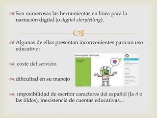 Este documento describe Storybird, una herramienta en línea gratuita para crear historias digitales a través de imágenes. Storybird permite escribir en español y es fácil de usar para maestros y estudiantes. Más de 125,000 escuelas a nivel mundial usan Storybird para mejorar las habilidades de escritura de los estudiantes de manera creativa e interactiva. Storybird también puede usarse para colaborar entre padres e hijos o entre estudiantes de diferentes países.
