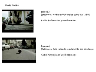 El documento presenta un storyboard para un comercial que consta de 17 escenas. La trama sigue a un hombre que pierde una bola de bolos de su cajuela de auto, la cual rueda colina abajo y casi atropella a un ciclista, quien decide intentar atraparla saltando de su bicicleta. Al final se muestra una promoción de lentes a mitad de precio para sugerir que el ciclista necesitaba anteojos para mejorar su visión.