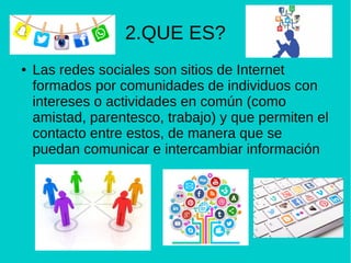 Las redes sociales son sitios de internet que permiten a las personas con intereses comunes comunicarse e intercambiar información. Sirven para mantener la comunicación con amigos, hacer nuevas conexiones, encontrar información y promocionarse. Algunas de las redes sociales más utilizadas son Facebook, YouTube, WhatsApp, QQ, WeChat y LinkedIn.