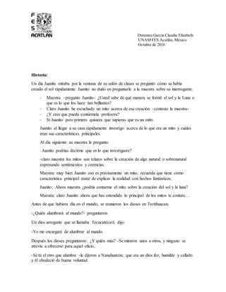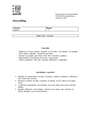 El documento explora el tema de los mitos y leyendas a través de un relato entre un niño y su maestra, quien le explica las características y propósitos de ambos tipos de narraciones. Se incluyen ejemplos y una representación a través de un sociodrama, así como un cuadro comparativo que detalla sus diferencias y similitudes. Los aprendizajes esperados abarcan el reconocimiento de la función cultural de estos relatos y su importancia en la tradición oral.