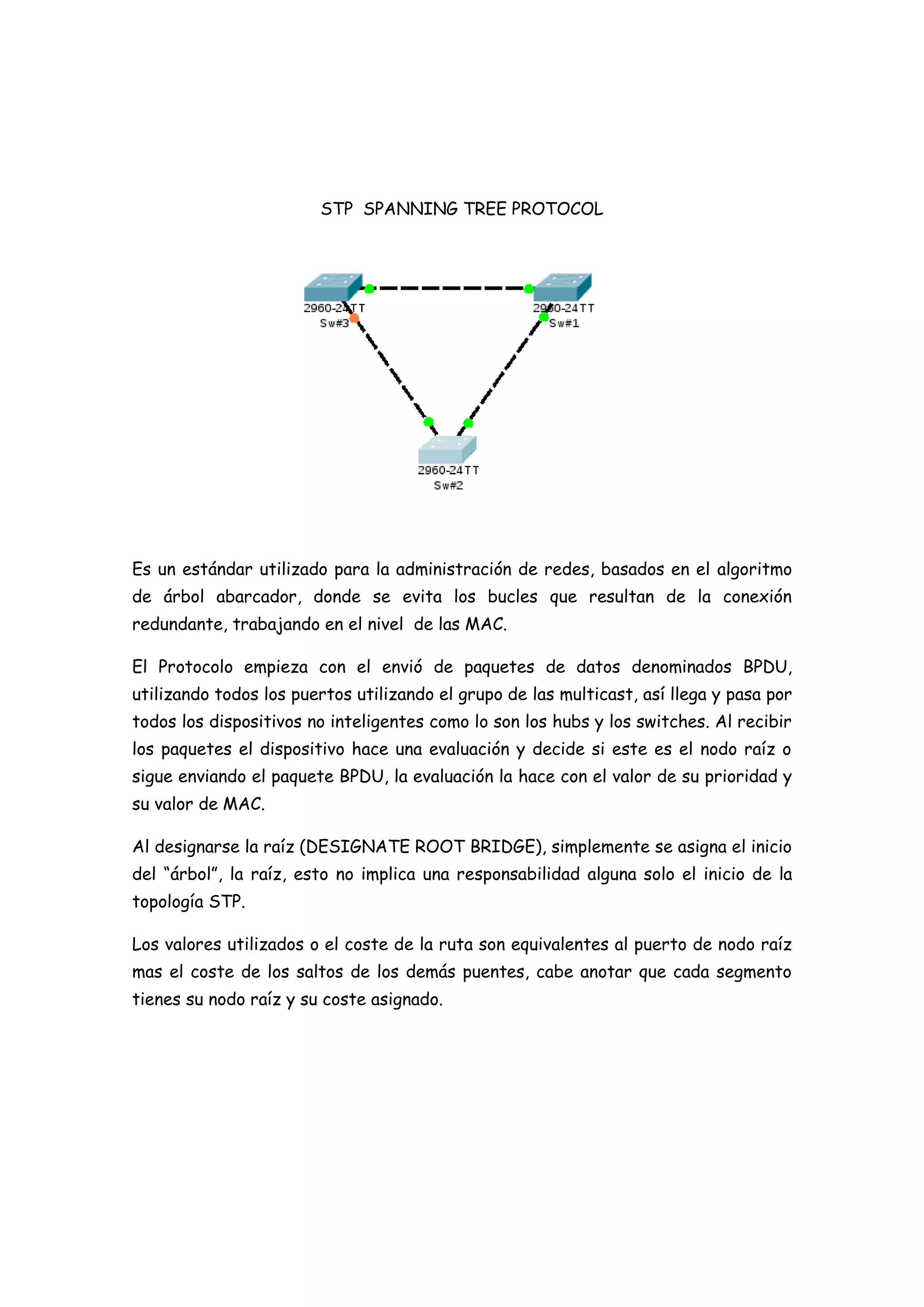 El documento describe el protocolo STP (Spanning Tree Protocol), el cual evita bucles en una red al designar un switch raíz y establecer una única ruta entre cada par de dispositivos. Explica que los switches intercambian paquetes BPDU para determinar la raíz basada en su prioridad y dirección MAC. Finalmente muestra ejemplos de la salida del comando "show spanning-tree" para identificar qué switch ha sido elegido como raíz.