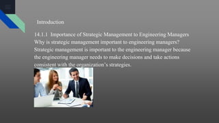 El documento proporciona una introducción a la gestión estratégica. Explica que la gestión estratégica es un proceso continuo que alinea las acciones de una organización con su dirección a largo plazo en función de las necesidades de los clientes. El proceso incluye ocho funciones: establecer la intención estratégica, implementar la intención estratégica, establecer la estrategia, asignar recursos, ejecutar la estrategia, medir los resultados, revisar el desempeño y aplicar las lecciones apre