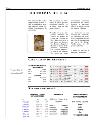Este documento resume la situación económica de México y otros países. La economía de México se contrajo un 2.2% debido a la reducción de exportaciones y el desplome del mercado interno, aunque aumentaron las remesas. Se proyecta un crecimiento del PIB de -0.9% para el cuarto trimestre y de 1.6% para todo el año. Las acciones de Walmex se espera que muestren un crecimiento de ventas de al menos 4.5-5%. Los mercados de futuros de commodities cayeron más de lo esper