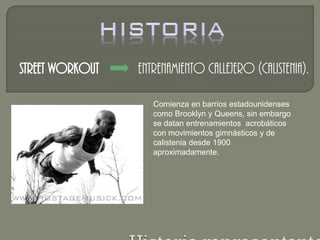 El documento describe el street workout o entrenamiento callejero, una disciplina deportiva que consiste en ejercitar el cuerpo usando elementos urbanos como barras. Se originó en barrios de Estados Unidos en los 1900s y luego se extendió a países como Ucrania, Rusia y España. En Colombia surgió una variante en 1950 en Bogotá que se enfoca más en la flexibilidad. El documento también presenta algunos de los practicantes más reconocidos de esta disciplina alrededor del mundo.