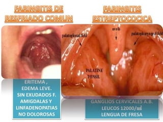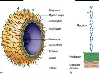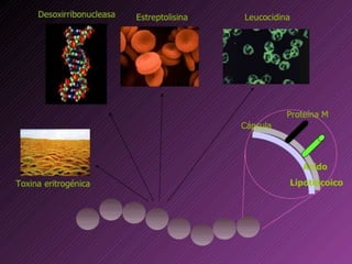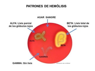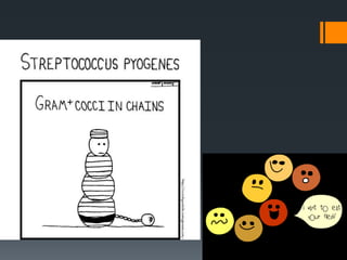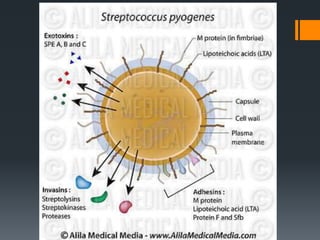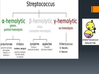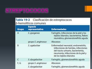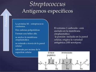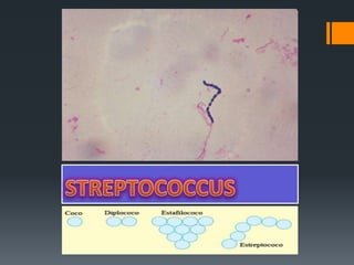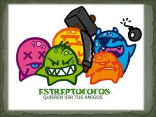 1) Los estreptococos son cocos Gram positivos que se disponen en cadenas o pares y son anaerobios facultativos. 2) Existen varios grupos de estreptococos clasificados por antígenos de superficie como los grupos A, B, C y D. 3) El estreptococo beta hemolítico del grupo A causa infecciones como faringitis estreptocócica, escarlatina, impétigo y fascitis necrotizante.
