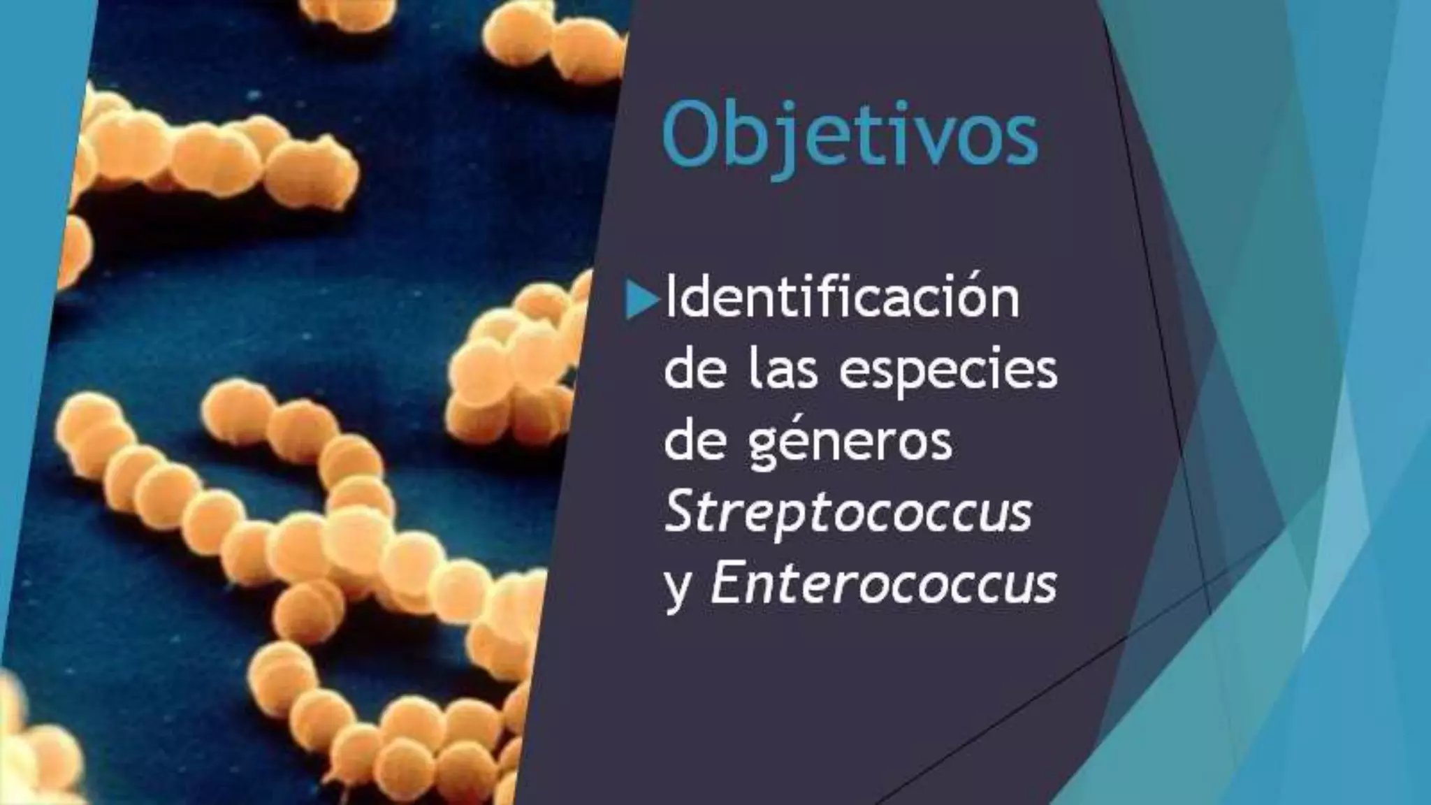 1) El documento describe las características y pruebas para identificar las bacterias Streptococcus y Enterococcus. 2) Incluye información sobre su taxonomía, localización en el cuerpo humano, medios de cultivo y pruebas bioquímicas como la bacitracina y la hidrólisis del hipurato. 3) También proporciona detalles sobre pruebas como CAMP y la tolerancia al telurito de potasio para diferenciar especies de Enterococcus.