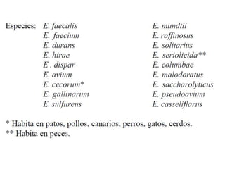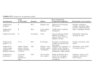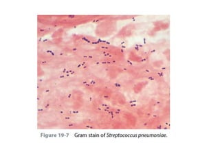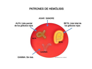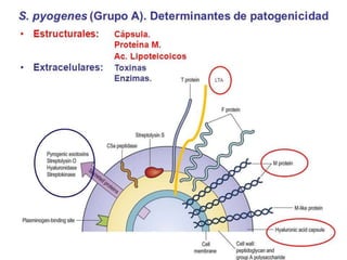 Streptococcus es un género de bacterias que incluye especies como S. pneumoniae, S. pyogenes y S. agalactiae. S. pneumoniae es un patógeno común que causa neumonía y meningitis, utilizando factores de virulencia como una cápsula polisacárida y pneumolisina. S. pyogenes causa amigdalitis y fiebre escarlatina mediante exotoxinas, mientras que S. agalactiae puede causar sepsis neonatal y meningitis neonatal a través de una cápsula y hemolisinas