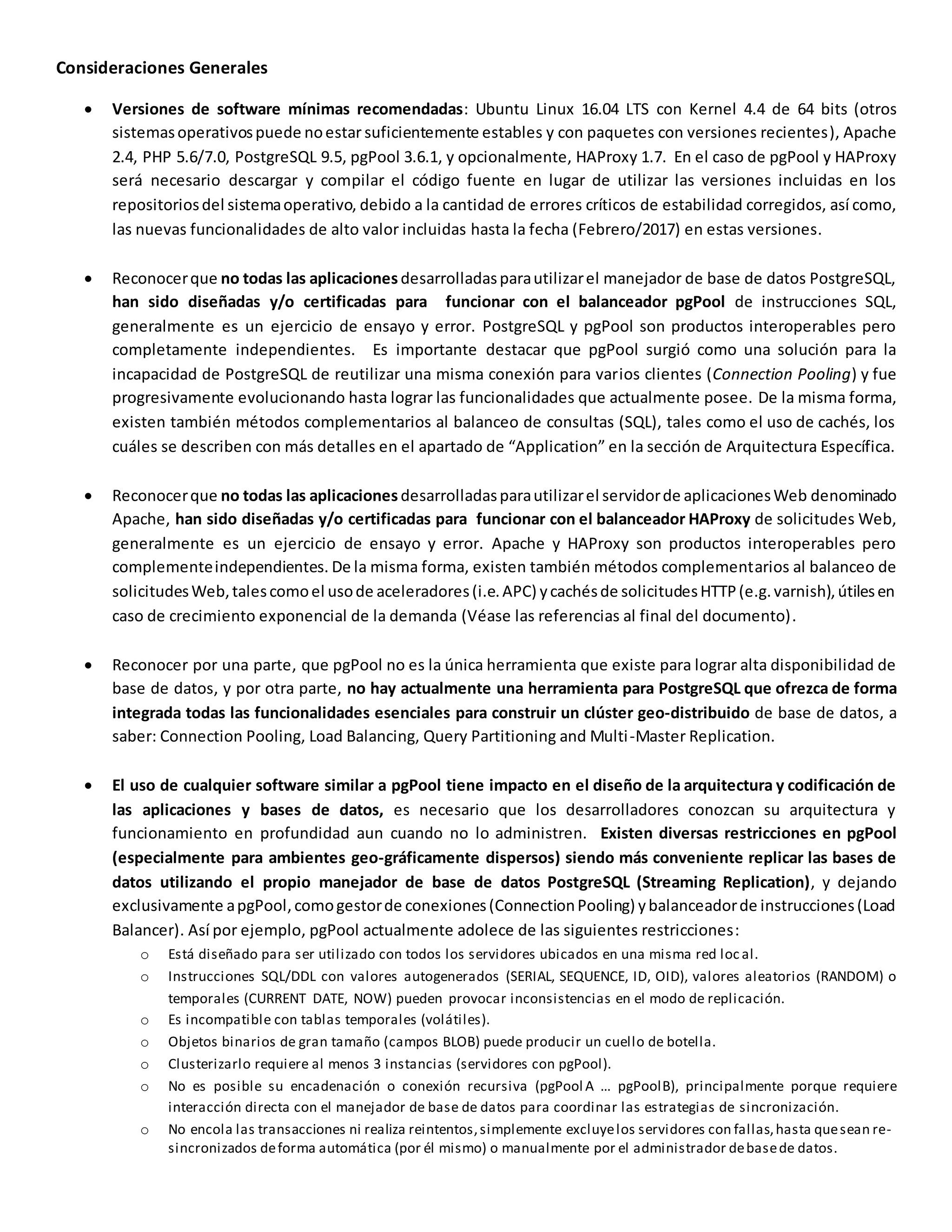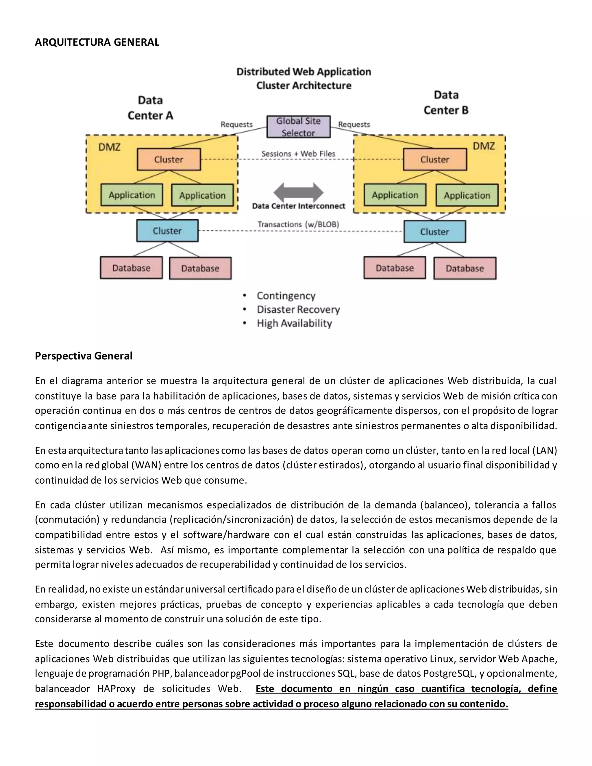 El documento describe la arquitectura de clústers de aplicaciones web distribuidas, enfatizando su importancia para la recuperación ante desastres y alta disponibilidad. Se discuten las mejores prácticas, consideraciones de implementación y las tecnologías recomendadas, como PostgreSQL y balanceadores como Pgpool y HAProxy. Además, se abordan las limitaciones y requisitos técnicos necesarios para asegurar la correcta configuración y operación de la arquitectura.