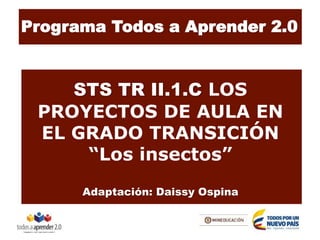 Este documento presenta las fases de un proyecto de aula sobre los insectos para el grado de transición. La fase 0 involucra explorar los intereses de los estudiantes, quienes tienen preguntas sobre los cucarrones. En la fase 1, los estudiantes y maestro definen y planean el proyecto asignando tareas. La fase 2 identifica los contenidos y competencias a desarrollar. La fase 3 implementa actividades para construir aprendizajes de forma progresiva. Finalmente, la fase 4 involucra socializar los resultados