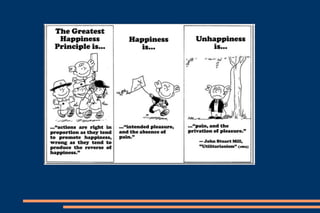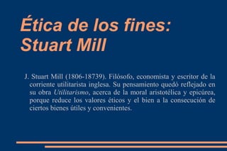 J. Stuart Mill fue un filósofo utilitarista inglés que defendió que las acciones son moralmente correctas si producen el mayor bienestar para el mayor número de personas. Según Mill, la utilidad es la capacidad de las cosas para producir placer o felicidad y evitar dolor o infelicidad. El utilitarismo se basa en el principio de la mayor felicidad y juzga las acciones en función de si producen bienestar o malestar.