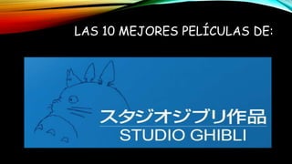 El documento proporciona información sobre 10 de las mejores películas del Studio Ghibli, un prestigioso estudio de animación japonés. Entre las películas destacadas se encuentran Mi Vecino Totoro, El Viaje de Chihiro, La Princesa Mononoke, El Castillo Ambulante, y Nausicaä del Valle del Viento. Cada película incluye una breve sinopsis de la trama.