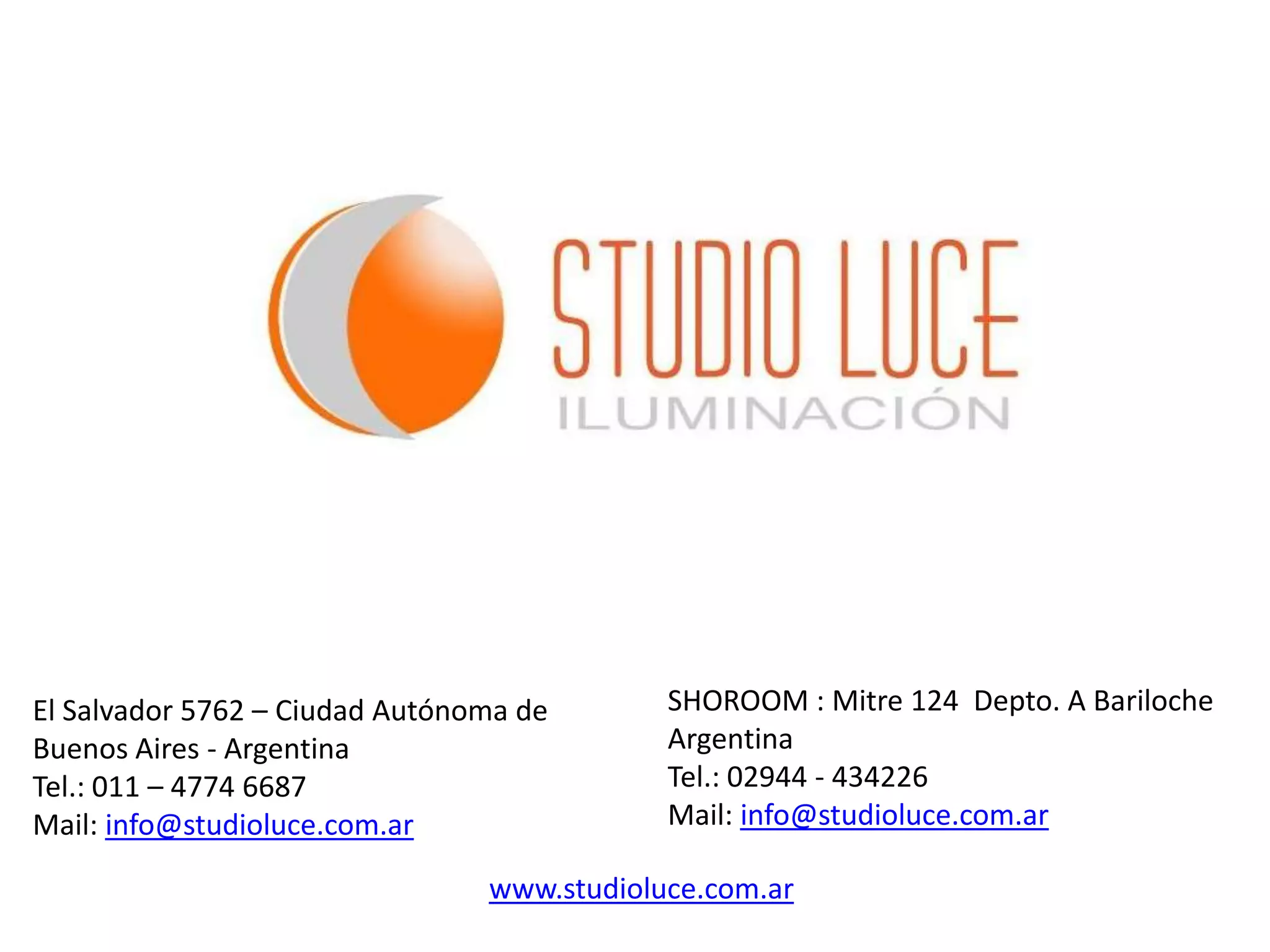 El documento proporciona los detalles de contacto de dos ubicaciones de Studio Luce, incluidas las direcciones, números de teléfono y direcciones de correo electrónico de sus oficinas en Buenos Aires y Bariloche, Argentina.