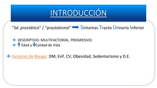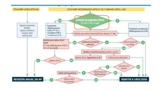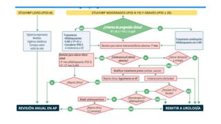 El documento describe el caso de un paciente de 65 años con síntomas del tracto urinario inferior mixtos moderados. Se realizó una evaluación completa incluyendo historia clínica, examen físico, IPSS, análisis de orina y eco de abdomen. Los resultados mostraron próstata aumentada de tamaño, IPSS moderado y orina normal. Se inició tratamiento con tamsulosina y se añadió solifenacina debido a persistencia de síntomas de llenado. El paciente será revisado anualmente para controlar sí