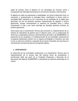 Este documento presenta los resultados de la coordinación técnica realizada para implementar la tercera fase del Sistema Único de Acreditación y Certificación (SUAC) en Colombia. Se destaca la necesidad de avanzar en una cultura de gestión pública basada en resultados para armonizar los esfuerzos del SUAC con las metas nacionales y departamentales. Adicionalmente, se propone construir un sistema de indicadores de gestión para el deporte que permita evaluar el cumplimiento de objetivos como aumentar la cobertura deportiva y promover el des
