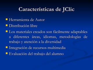 JClic es una herramienta de autor gratuita que permite crear actividades educativas multimedia como rompecabezas, asociaciones y juegos. Los materiales creados se pueden adaptar fácilmente a diferentes áreas, idiomas y necesidades, y se pueden integrar recursos como texto, gráficos, sonido y video. Las actividades se pueden organizar en paquetes secuenciales y el programa registra el progreso de los estudiantes. Funciona en múltiples sistemas operativos y se puede conectar a módulos externos