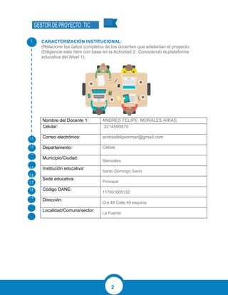 Este documento presenta un proyecto educativo TIC para desarrollar el pensamiento numérico en estudiantes de grado 8to mediante el uso de herramientas TIC y componentes robóticos para construir un prototipo de célula. El proyecto se llevará a cabo en la Institución Educativa Santo Domingo Savio e involucra a 5 docentes. El objetivo general es desarrollar habilidades en ciencias naturales y matemáticas aplicando conocimientos matemáticos para construir un prototipo robótico.