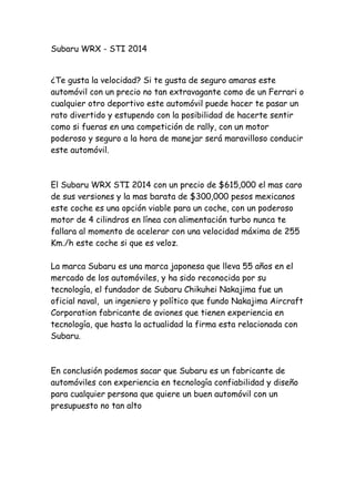 Este documento describe el Subaru WRX STI 2014, un automóvil deportivo con un poderoso motor de 4 cilindros y una velocidad máxima de 255 km/h, pero a un precio más accesible que otros deportivos de lujo. La marca Subaru tiene 55 años de experiencia en la industria automotriz y es conocida por su tecnología confiable.
