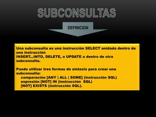 Una subconsulta es una instrucción SELECT anidada dentro de otra instrucción como INSERT, DELETE, UPDATE o dentro de otra subconsulta. Puede utilizar comparaciones, expresiones IN o EXISTS para crear subconsultas que se pueden usar en cláusulas como WHERE, HAVING y FROM para seleccionar filas basadas en datos de la misma u otras tablas.