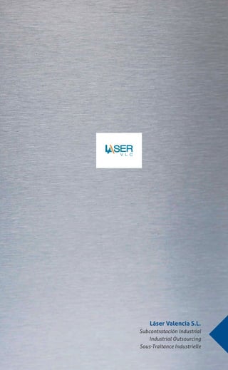 Este documento presenta a Láser Valencia, una empresa de subcontratación industrial que ofrece servicios como corte, doblado, soldadura y mecanizado de metales. La empresa tiene instalaciones en varias ciudades españolas y sectores de actividad que incluyen naval, energía, construcción y maquinaria industrial. El documento también describe los medios técnicos de la empresa como máquinas de corte láser, plegadoras y hornos de tratamiento térmico, y muestra ejemplos de trabajos realizados para el sector ferroviario.