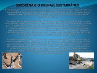 Este documento describe los beneficios y usos de los sistemas de subdrenaje o drenaje subterráneo. Estos sistemas incluyen zanjas de drenaje y tubos perforados que interceptan el flujo de agua subterránea para facilitar la construcción de carreteras, aumentar la capacidad portante del suelo, estabilizar taludes y prevenir la formación de lodazales debajo de presas. Los sistemas de subdrenaje también pueden usarse para disminuir las presiones del agua dentro de taludes de corte y mejorar el