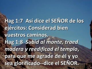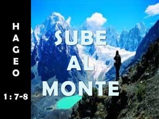 Este documento contiene varias secciones que discuten la importancia de subir al monte para recibir los diseños de Dios. El monte representa entrar en la presencia de Dios, donde Él revela Sus planes y propósitos. Los diseños de Dios son como la madera que se necesita para reconstruir el templo en la tierra y llevar a cabo la obra de Dios. Se insta a los lectores a buscar a Dios, purificar sus corazones y recibir los diseños especiales que Él tiene preparados para sus vidas.