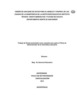 Este documento presenta el diseño de una base de datos para el manejo y control de las causas de inasistencia de los estudiantes del Instituto Técnico Cristo Obrero Paz y Futuro en Cúcuta, Colombia. Actualmente la institución no cuenta con un sistema organizado para registrar y dar seguimiento a los casos de inasistencia y sus causas, lo que dificulta mejorar los procesos de enseñanza-aprendizaje. El objetivo general es diseñar una base de datos que permita registrar de manera sistemática la asistencia de