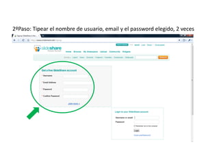 Para subir una presentación a SlideShare, primero debes registrarte en el sitio web e ingresar tu nombre de usuario, correo electrónico y contraseña, luego puedes invitar amigos o saltar este paso. Después, selecciona el archivo que deseas subir y espera a que termine de cargar, finalmente describe la presentación con un título y categoría para compartirla.