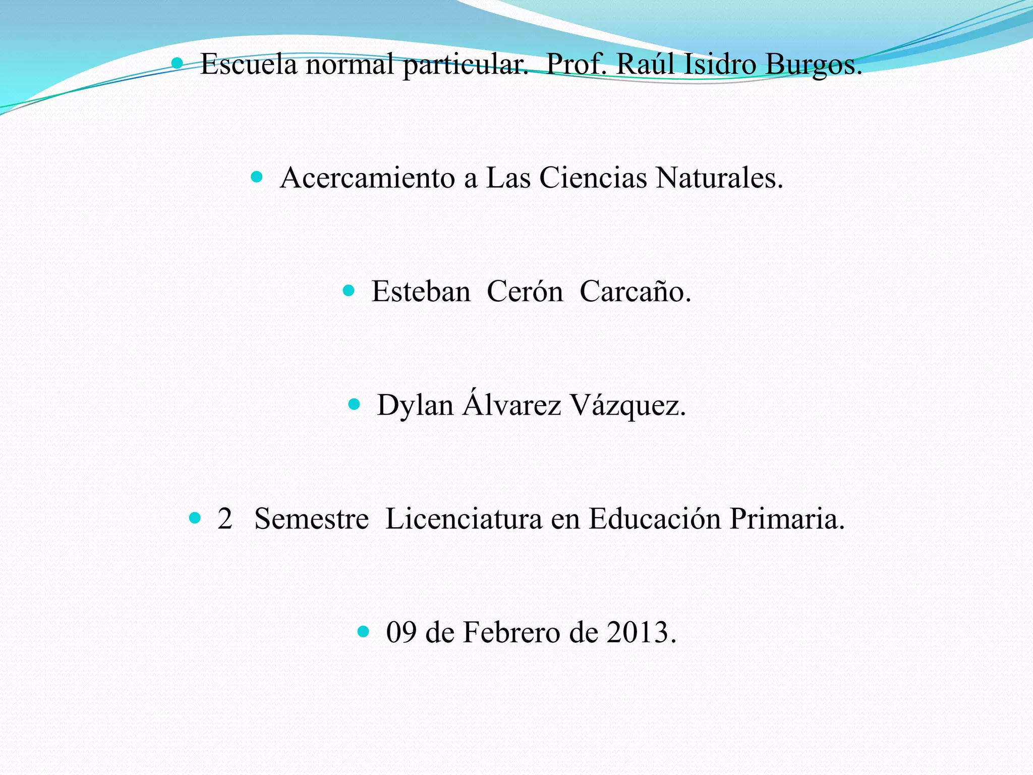 El documento presenta la información de un proyecto de ciencias naturales realizado por Esteban Cerón Carcaño y Dylan Álvarez Vázquez para su segundo semestre de la Licenciatura en Educación Primaria. El proyecto fue supervisado por el profesor Raúl Isidro Burgos en la Escuela Normal Particular el 9 de febrero de 2013. El documento también indica que al finalizar la unidad, los estudiantes deben presentar una exposición oral utilizando herramientas como carteles y diapositivas para mostrar los resultados y la información más