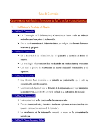 El documento describe 10 posibilidades educativas de las TIC como la inmaterialidad, interconexión, interactividad e instantaneidad de la información, así como la aparición de nuevos lenguajes y códigos y la ruptura de la linealidad expresiva. También describe 5 limitaciones de las TIC en educación como problemas técnicos, falta de formación docente, problemas con contenidos multimedia y distracción de estudiantes. El objetivo es analizar el potencial y desafíos de integrar las TIC en procesos educativos.