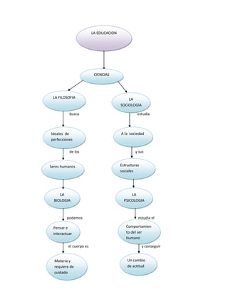 Este documento trata sobre varios temas relacionados con la educación como la filosofía, la sociología, la biología y la psicología. También discute cómo la educación orienta el desarrollo de la persona a través de la inculcación de valores y desempeña un papel en el sistema de relaciones sociales. Por último, menciona las tecnologías de la información y comunicación en la educación y cómo representan una revolución digital y de la sociedad de la información.
