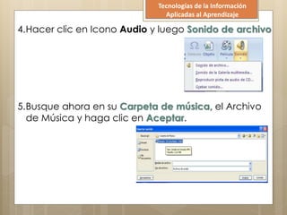 El documento proporciona instrucciones en 8 pasos para insertar música en una presentación de PowerPoint. Estos pasos incluyen crear una carpeta para guardar la música, insertar un archivo de audio en PowerPoint desde esa carpeta, y configurar la reproducción y duración de la música en la presentación.