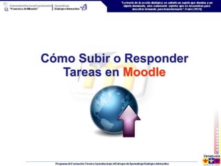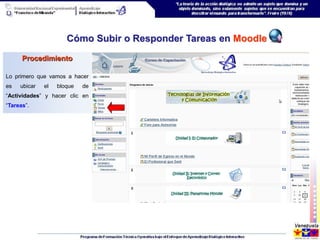 Este documento explica cómo los estudiantes pueden completar y enviar tareas en la plataforma Moodle. Primero, los estudiantes deben encontrar el bloque de "Actividades" y hacer clic en "Tareas" para ver una lista de tareas asignadas. Luego, al hacer clic en una tarea específica, se les darán instrucciones y una fecha límite para completarla. Para tareas que requieren el envío de un archivo, los estudiantes deben cargar el archivo completado usando el botón "Examinar", y luego hacer clic en "Subir archivo