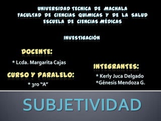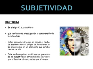 Este documento describe la historia de la subjetividad y su papel en la teoría del conocimiento. Los primeros filósofos de la naturaleza en Mileto en el siglo VI a.C. buscaban comprender la naturaleza y creían que su origen residía en un elemento interno. La subjetividad se refiere al modo de sentir y pensar propio del sujeto, en contraposición a la objetividad. La subjetividad configura sentidos, proporciona criterios metodológicos y da libertad para vivir y repensar pregunt