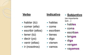 El documento proporciona información sobre el uso del subjuntivo en español. Explica las conjugaciones del subjuntivo y del indicativo de varios verbos. Ofrece recomendaciones sobre cómo usar expresiones que requieren el subjuntivo como "es importante que" o "espero que". También discute el uso del subjuntivo en cláusulas adjetivales y oraciones condicionales.
