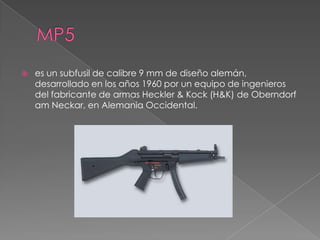 Este documento describe las características de varias ametralladoras y subfusiles, incluyendo el UMP desarrollado por Heckler & Koch, el PP-19 ruso calibre 9mm, el FN P90 belga principalmente de polímero, y el HK MP7 que utiliza la munición 4,6 x 30 mm y está hecho mayormente de polímeros.