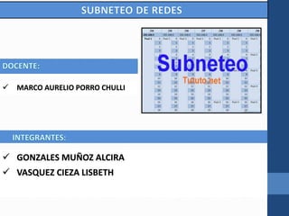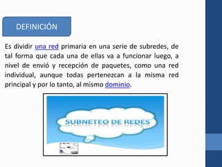 El documento define el proceso de subneteo y sus características. El subneteo es dividir una red primaria en subredes más pequeñas para mejorar el envío y recepción de paquetes. Se debe seleccionar la cantidad de bits para cada subred dependiendo del número de hosts requeridos. El proceso varía según la clase de dirección IP utilizada (A, B, C). El objetivo del subneteo es proporcionar un mejor manejo de las redes a medida que estas crecen.