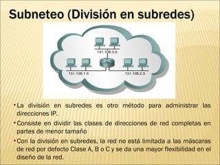 El documento habla sobre el subdividir redes usando subredes. Esto permite dividir las clases de direcciones IP en partes más pequeñas para dar más flexibilidad al diseño de la red. Se explica cómo se asignan bits a la red y subred, y cómo esto determina el número de subredes y hosts disponibles. Finalmente, da un ejemplo de cómo dividir una red clase C en 8 subredes usando 3 bits para la subred.