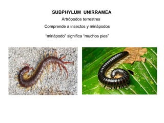 Los miriápodos incluyen ciempiés, milpiés, paurópodos y sínfilos. Los ciempiés tienen cuerpos cilíndricos y son depredadores agresivos, mientras que los milpiés tienen muchas patas y segmentos que añaden cuando crecen. Los pequeños paurópodos carecen de sistemas circulatorio y respiratorio y se alimentan de hongos, e los sínfilos se reproducen sexualmente y sus crías pasan por un desarrollo indirecto.