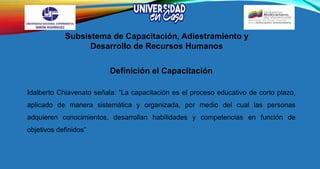 El documento aborda la identificación y objetivos del subsistema de capacitación, adiestramiento y desarrollo de recursos humanos en las organizaciones. Destaca la importancia de capacitar a los empleados para mejorar su desempeño, actitudes y preparación ante nuevas funciones. Además, establece claras distinciones entre capacitación, adiestramiento y desarrollo, enfatizando sus objetivos y enfoques específicos.