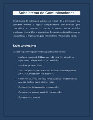 El documento presenta un análisis detallado de diversos subsistemas de comunicación, incluyendo redes LAN y WAN, y la importancia del acceso a Internet y los servicios de banda ancha. También aborda la informática de servicios y en la nube, destacando sus ventajas, y menciona varios servicios de valor añadido como audioconferencias, VoIP y videoconferencias. Se concluye que la videoconferencia es una herramienta clave en el crecimiento de las telecomunicaciones por facilitar la comunicación entre ubicaciones distantes de forma económica y eficiente.