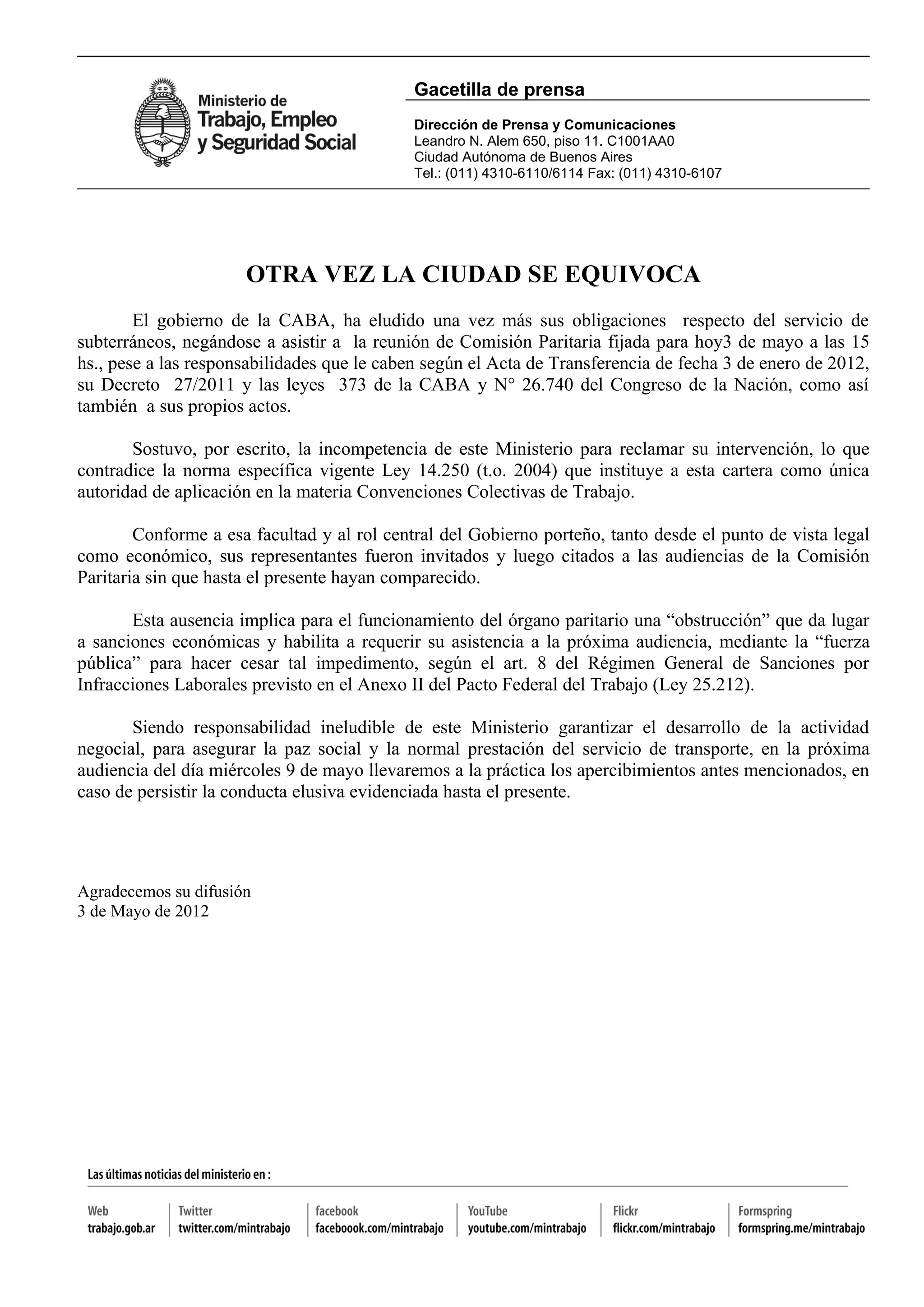 El gobierno de la Ciudad Autónoma de Buenos Aires se negó a asistir a una reunión de la Comisión Paritaria el 3 de mayo a pesar de sus obligaciones legales de participar en las negociaciones colectivas sobre el servicio de subterráneos. El Ministerio de Trabajo, Empleo y Seguridad Social citó a los representantes de la ciudad a la próxima audiencia el 9 de mayo y aplicará sanciones económicas si vuelven a ausentarse para garantizar el diálogo y la prestación normal del servicio.