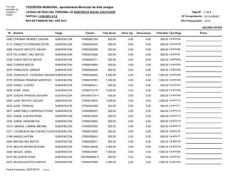 Este documento es una lista de pago de personal de asistencia social y educación para el mes de febrero de 2015 en Villa Jaragua. Contiene información sobre 65 empleados como nombre, cédula, cargo, sueldo bruto, deducciones e ingreso neto. El total de sueldos brutos pagados fue de 40,900 pesos.