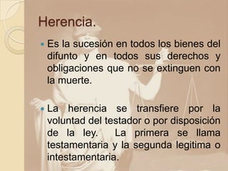El documento resume los principales aspectos de la herencia y los testamentos según el derecho mexicano. Explica que la herencia transfiere los bienes y derechos del difunto a sus herederos por voluntad del testador o por disposición de la ley. Detalla los diferentes tipos de testamentos como el público abierto, público cerrado, ológrafo, privado, militar y marítimo, y especifica los requisitos para cada uno. También define conceptos clave como heredero, albacea y sucesión testamentaria e intestamentaria.