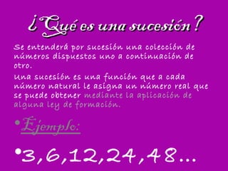 Este documento define una sucesión como una colección de números dispuestos uno a continuación del otro. Explica que una sucesión es una función que asigna números reales siguiendo alguna ley de formación. Distingue entre sucesiones aritméticas, donde cada elemento se obtiene sumando un número fijo al anterior, y sucesiones geométricas, donde cada elemento se obtiene multiplicando al anterior por un número fijo. Proporciona ejemplos de ambos tipos de sucesiones y cómo calcular sus términos generales.