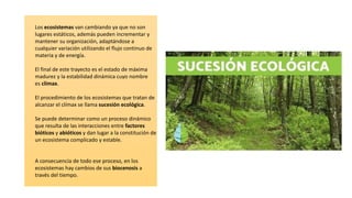 Los ecosistemas cambian a través del tiempo mediante procesos de sucesión ecológica y pueden experimentar tanto aumentos como disminuciones en su complejidad. La sucesión ecológica implica cambios progresivos en la biocenosis de un ecosistema que lo llevan de un estado inicial menos complejo hacia uno más complejo y estable conocido como clímax.