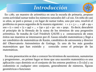 Este documento presenta conceptos básicos sobre sucesiones, sumatorias, progresiones aritméticas y progresiones geométricas. Define una sucesión como una aplicación cuyo dominio son los números enteros positivos y explica diferentes tipos de sucesiones como convergentes, divergentes y oscilantes. También introduce la notación sigma para calcular sumas y da ejemplos de propiedades de las sumatorias. Finalmente, explica que una progresión aritmética es una sucesión donde la diferencia entre términos es constante y una progresión geom