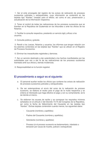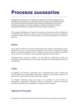 El documento describe el Registro de Procesos Sucesorios de Guatemala, el cual registra información sobre procesos sucesorios judiciales y extrajudiciales para evitar duplicidad. Su misión es facilitar la comprobación de procesos sucesorios de un mismo causante y prestar información a la sociedad de manera eficiente. Mantiene registros de los procesos sucesorios tramitados ante tribunales o notarios de forma alfabética y cronológica, y provee certificaciones e informes a jueces, notarios y usuarios.