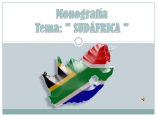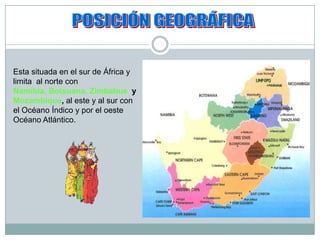 Sudáfrica se encuentra en el sur de África, limita con varios países y tiene una superficie de 1.219.090 km2. El relieve está definido por una gran meseta y la cordillera Drakensberg, con el Castillo de Champagne como el punto más alto. Los ríos más importantes son el Orange, Vaal y Limpopo. La vegetación y fauna varían según la región, y el país es rico en recursos minerales como oro, carbón y diamantes. Las mayores ciudades son Ciudad del Cabo, Durban, Pretoria y Johannesbur