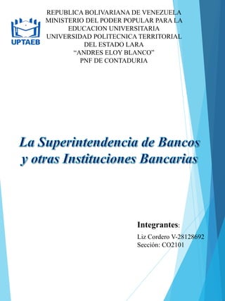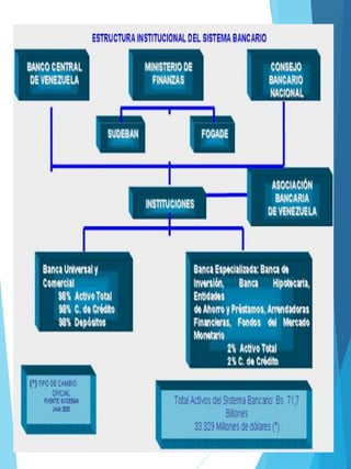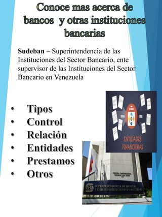 La SUDEBAN es el ente supervisor de las instituciones del sector bancario en Venezuela. Entre sus funciones se encuentran autorizar, supervisar, inspeccionar, controlar y regular la actividad de las instituciones bancarias del país. La SUDEBAN puede aplicar medidas administrativas como la suspensión o revocatoria de autorizaciones, la intervención o estatización de bancos, y sancionar infracciones con multas. El Consejo Superior integrado por el Ministro de Finanzas y otros funcionarios debe opinar sobre asuntos como la apertura