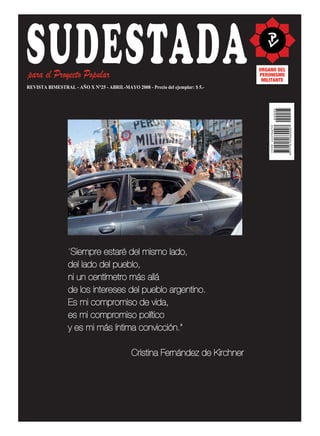 El documento presenta varios artículos de la revista "Sudestada" que abordan temas políticos y económicos de Argentina. El editorial argumenta que el Estado debe intervenir para contrarrestar los monopolios y orientar la economía hacia el beneficio del pueblo, como se hizo en 1945, para promover la justicia social.
